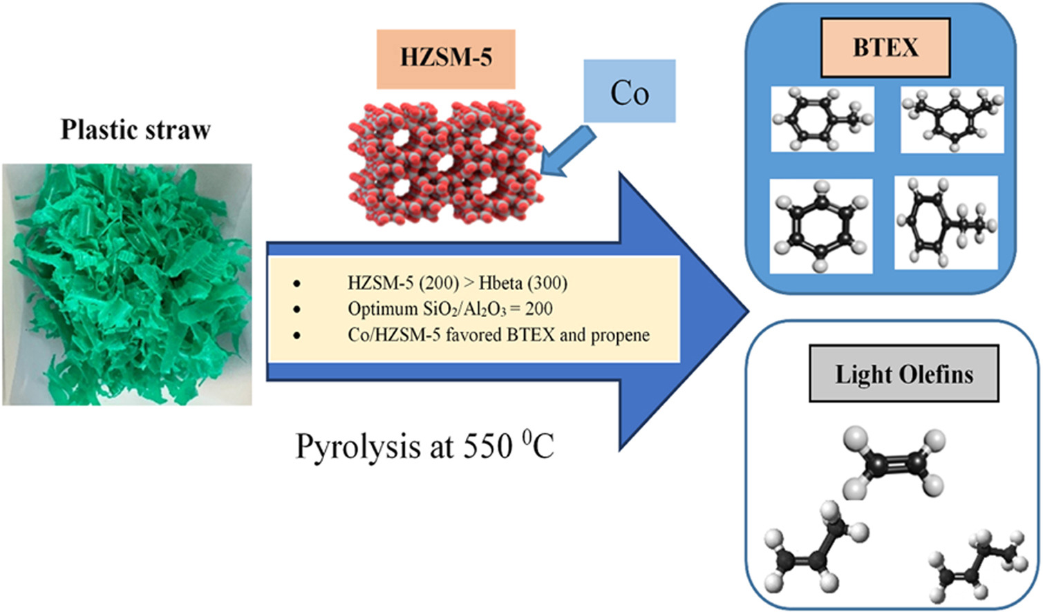 • Production of light olefins and monocyclic aromatic hydrocarbons from the pyrolysis of waste plastic straws over high-silica zeolite-based catalysts